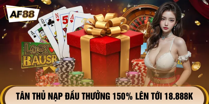 Khuyến mãi AF88 áp dụng cho tài khoản mới đăng ký lần đầu tại AF88 và chưa từng phát sinh giao dịch trước đó. Người chơi thực hiện nạp tiền tối thiểu theo quy định sẽ nhận thưởng 150%, tối đa 18.888K, áp dụng cho casino, thể thao hoặc đá gà. Khoản thưởng được cộng sau khi người chơi chọn đúng danh mục ưu đãi.